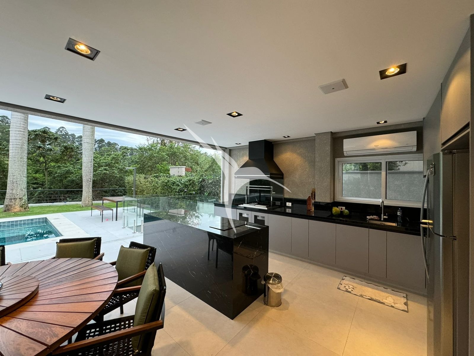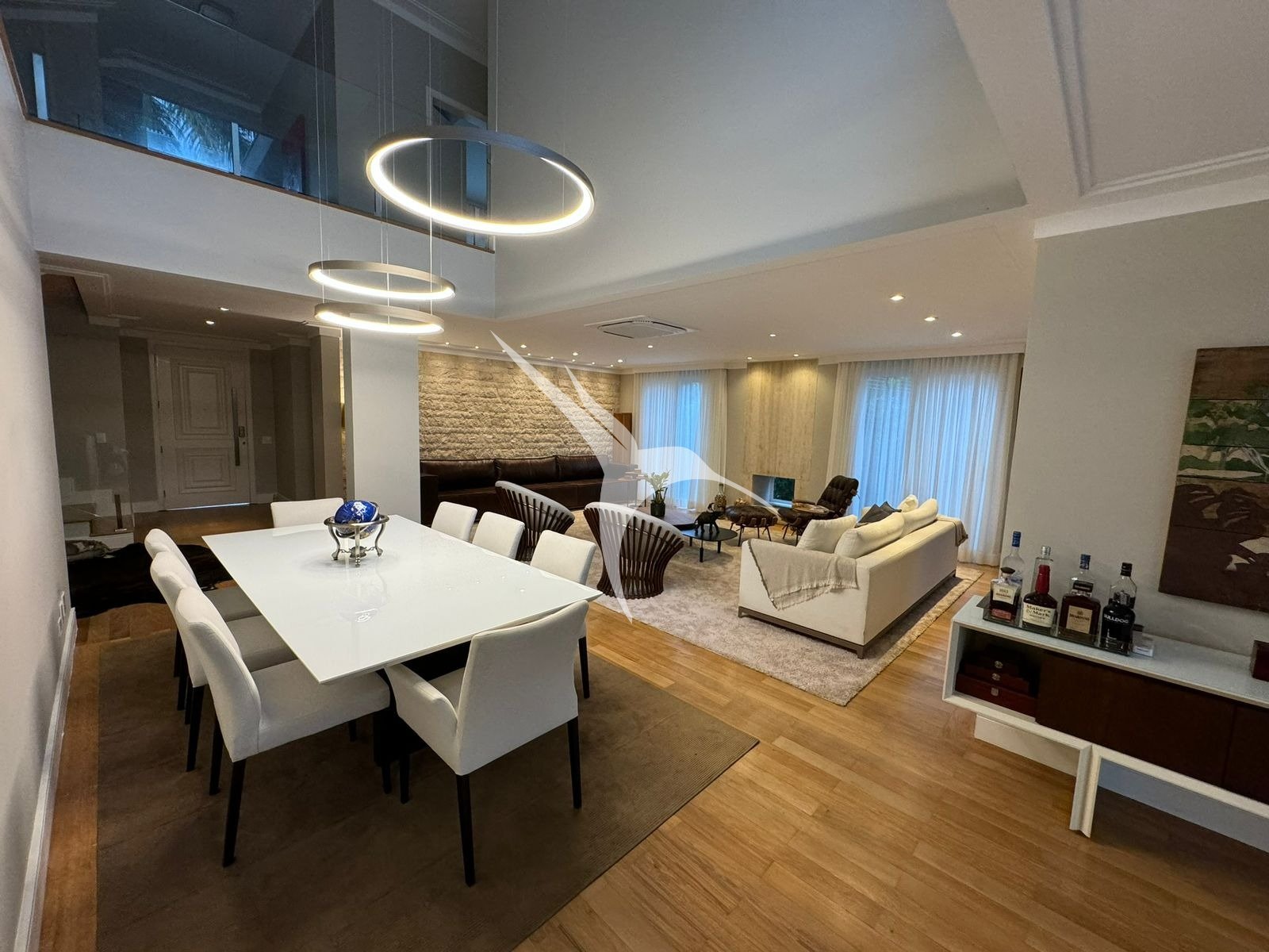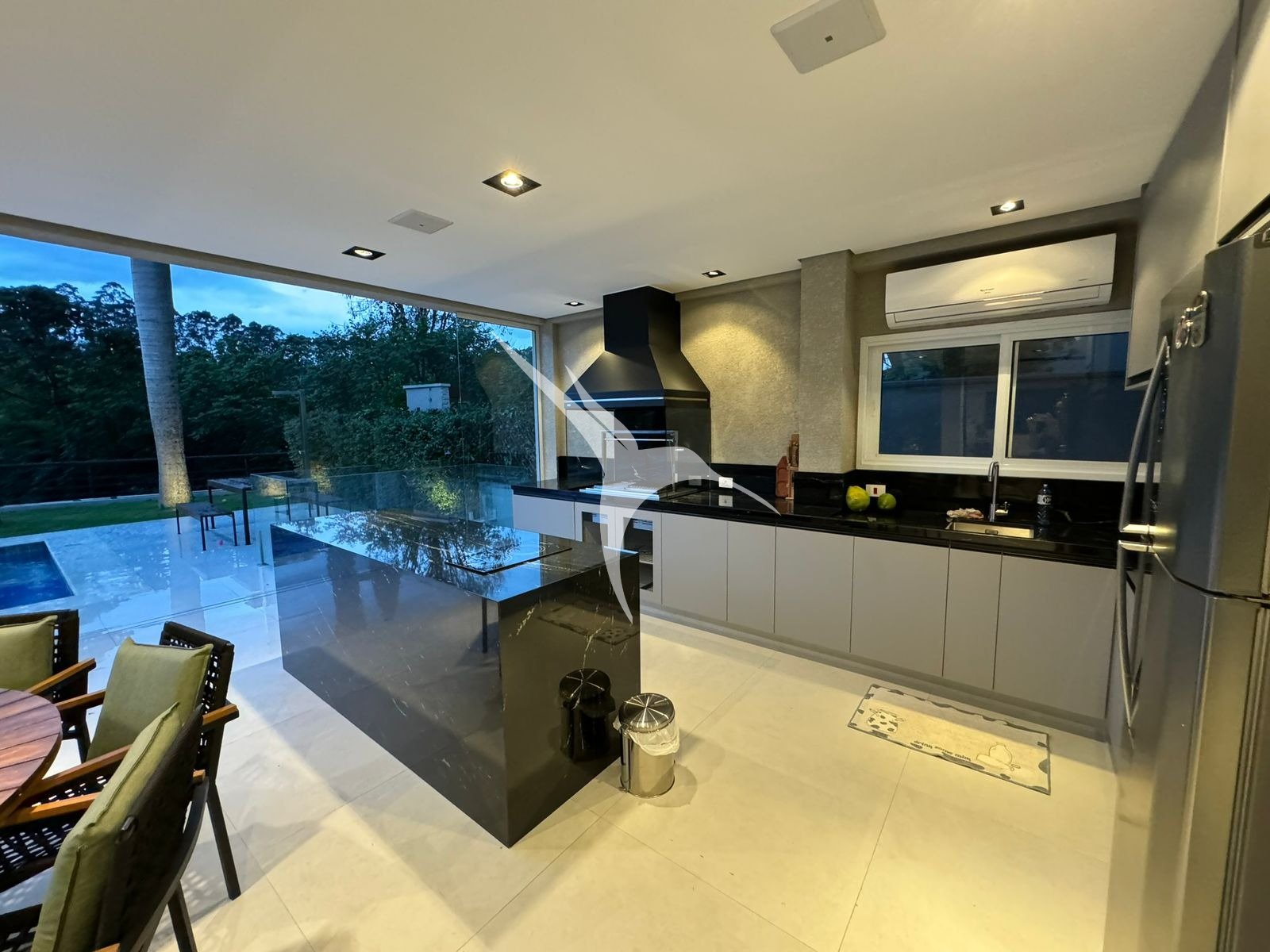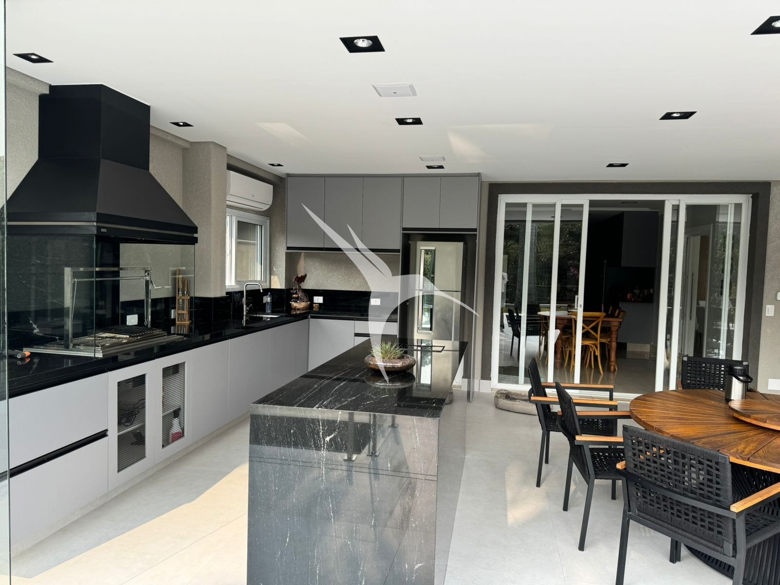 Piso Térreo contendo 1 escritório, Home Theater, Living/Lareira ecológica, sala de jantar com pé direito duplo, Adega, cozinha com sala de almoço, lavabo, piscina aquecida e iluminação em Led, fundo pra reserva ambiental, dispensa com prateleiras, lavanderia, suíte de empregada; lavanderia, Garagem para 3 carros e Wallbox (Tomada pra carro elétrico);