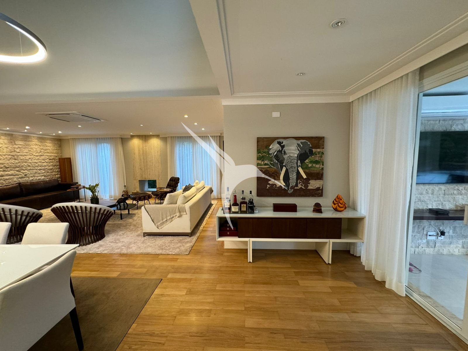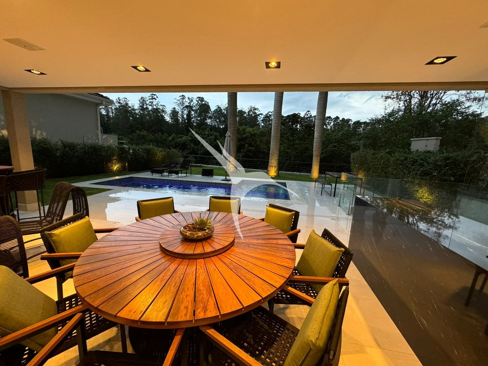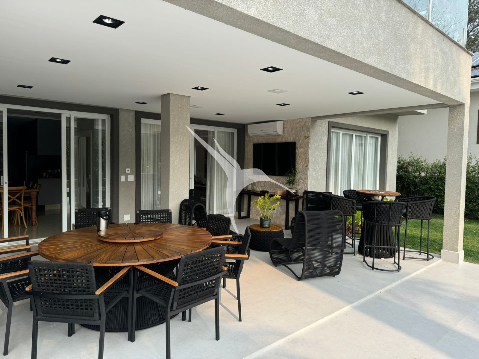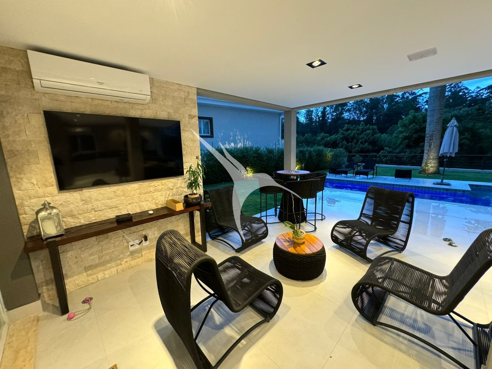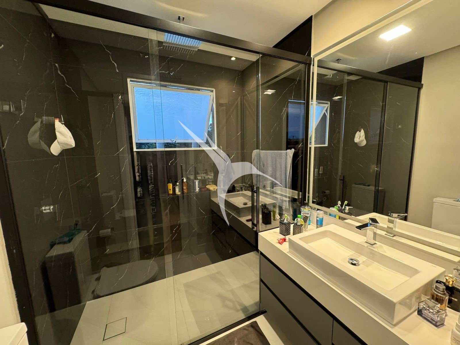 Piso Térreo contendo 1 escritório, Home Theater, Living/Lareira ecológica, sala de jantar com pé direito duplo, Adega, cozinha com sala de almoço, lavabo, piscina aquecida e iluminação em Led, fundo pra reserva ambiental, dispensa com prateleiras, lavanderia, suíte de empregada; lavanderia, Garagem para 3 carros e Wallbox (Tomada pra carro elétrico);