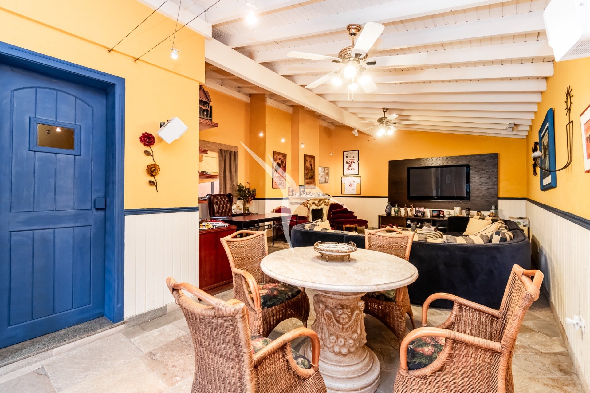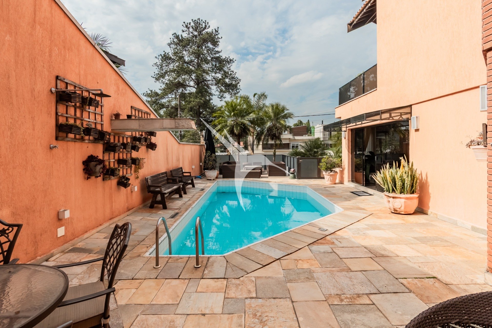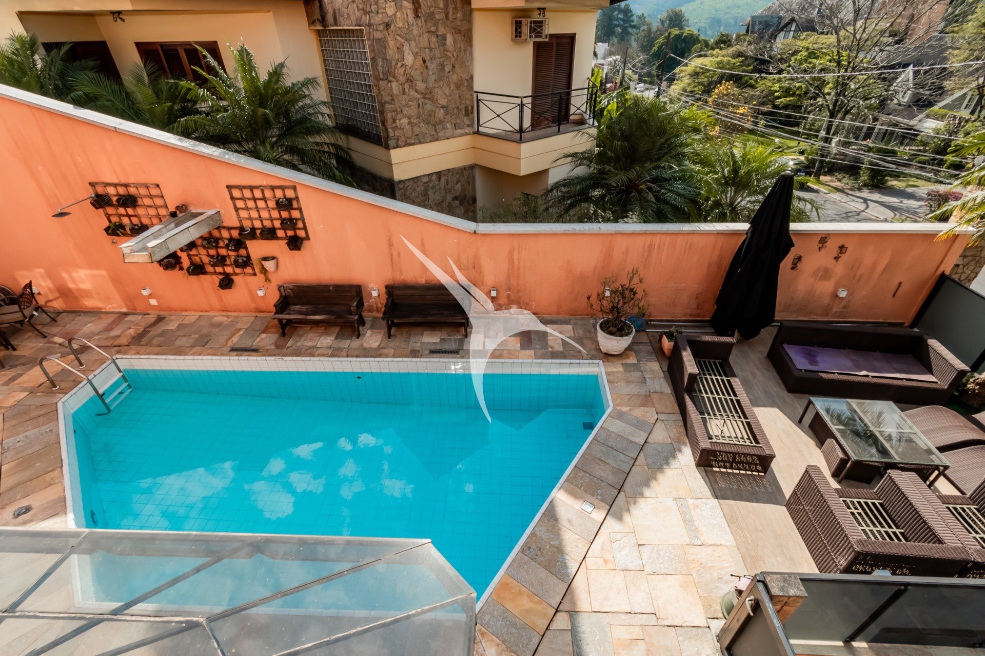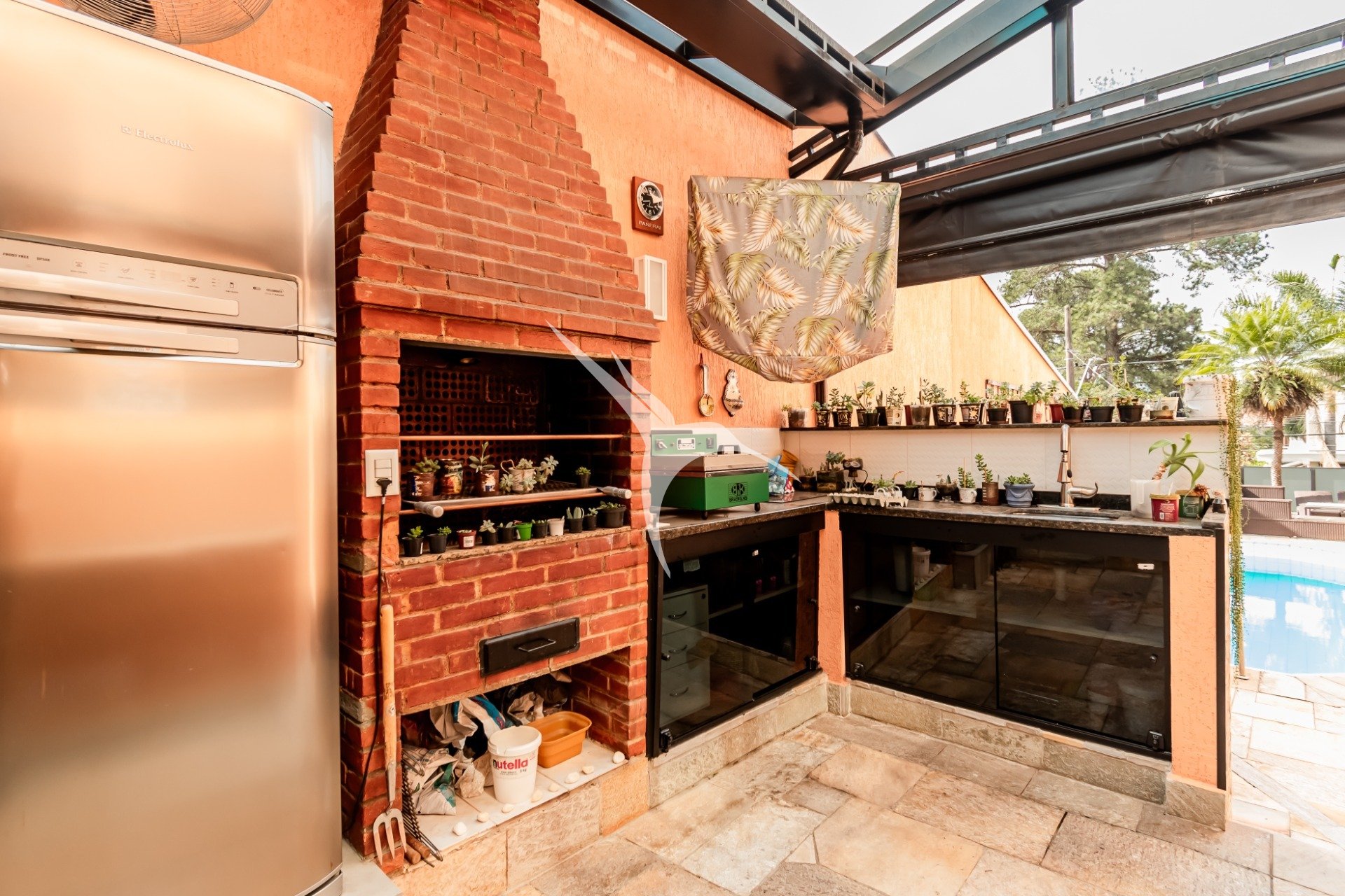 A área social é integrada e reúne sala de estar, cozinha planejada, lareira e um espaço externo com piscina e churrasqueira - perfeito para momentos de lazer.