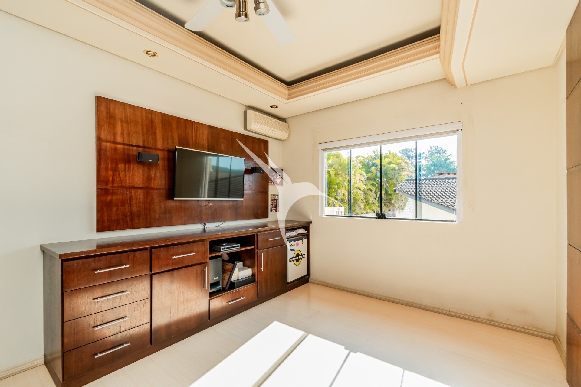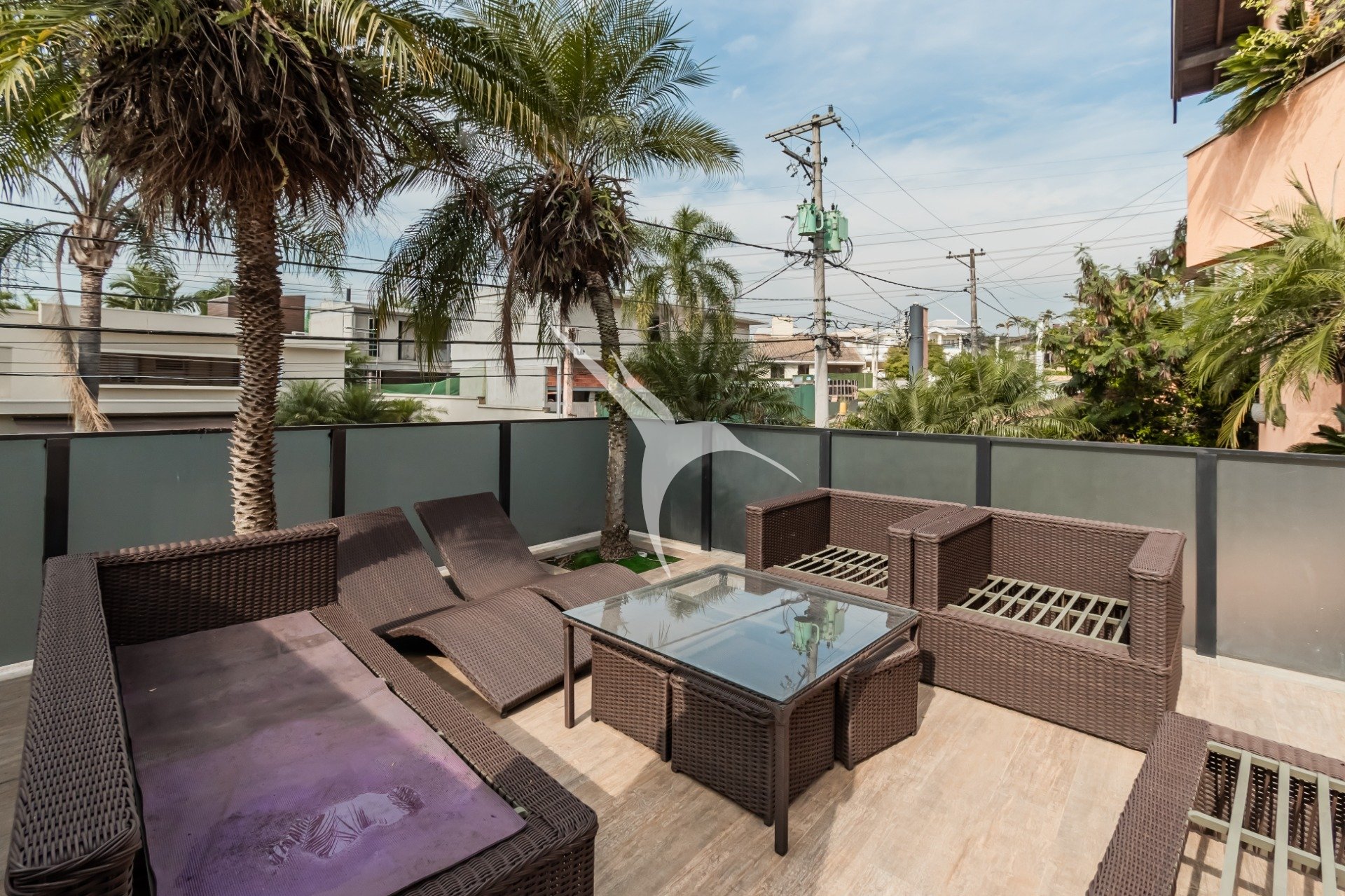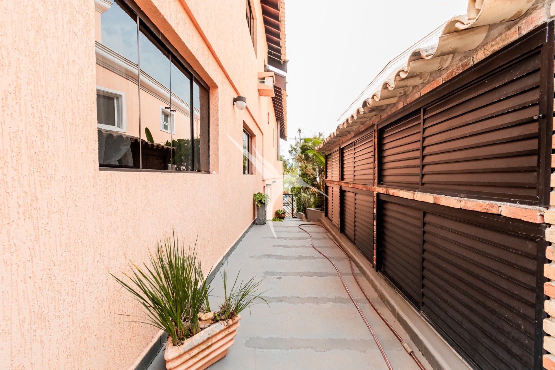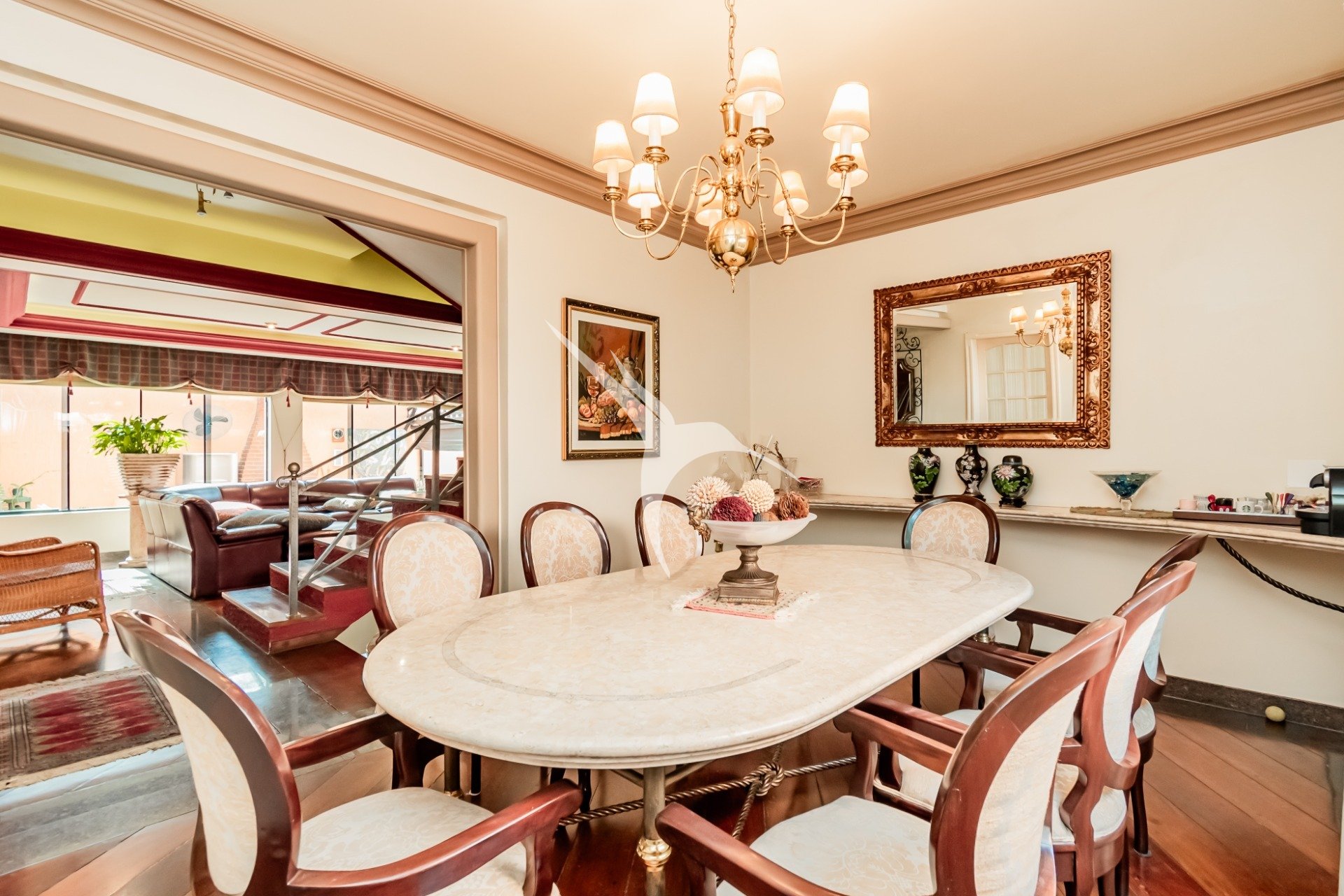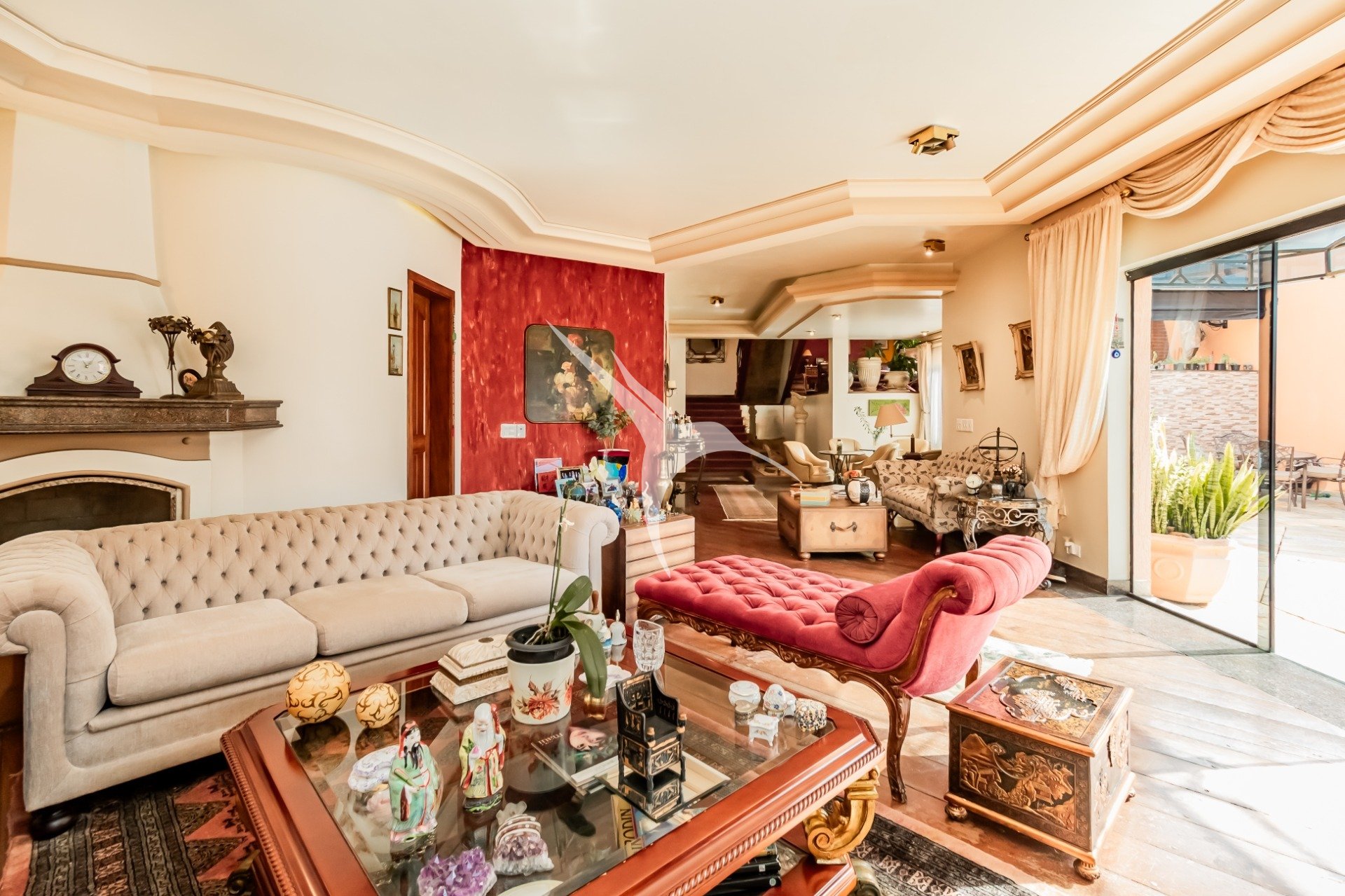 A área social é integrada e reúne sala de estar, cozinha planejada, lareira e um espaço externo com piscina e churrasqueira - perfeito para momentos de lazer.