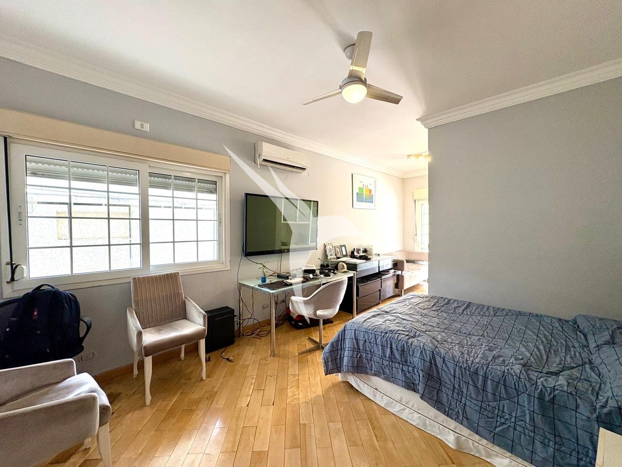 Sala ampla com 3 ambientes (jantar, estar e TV)