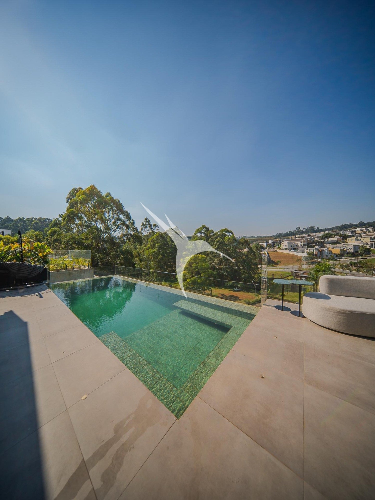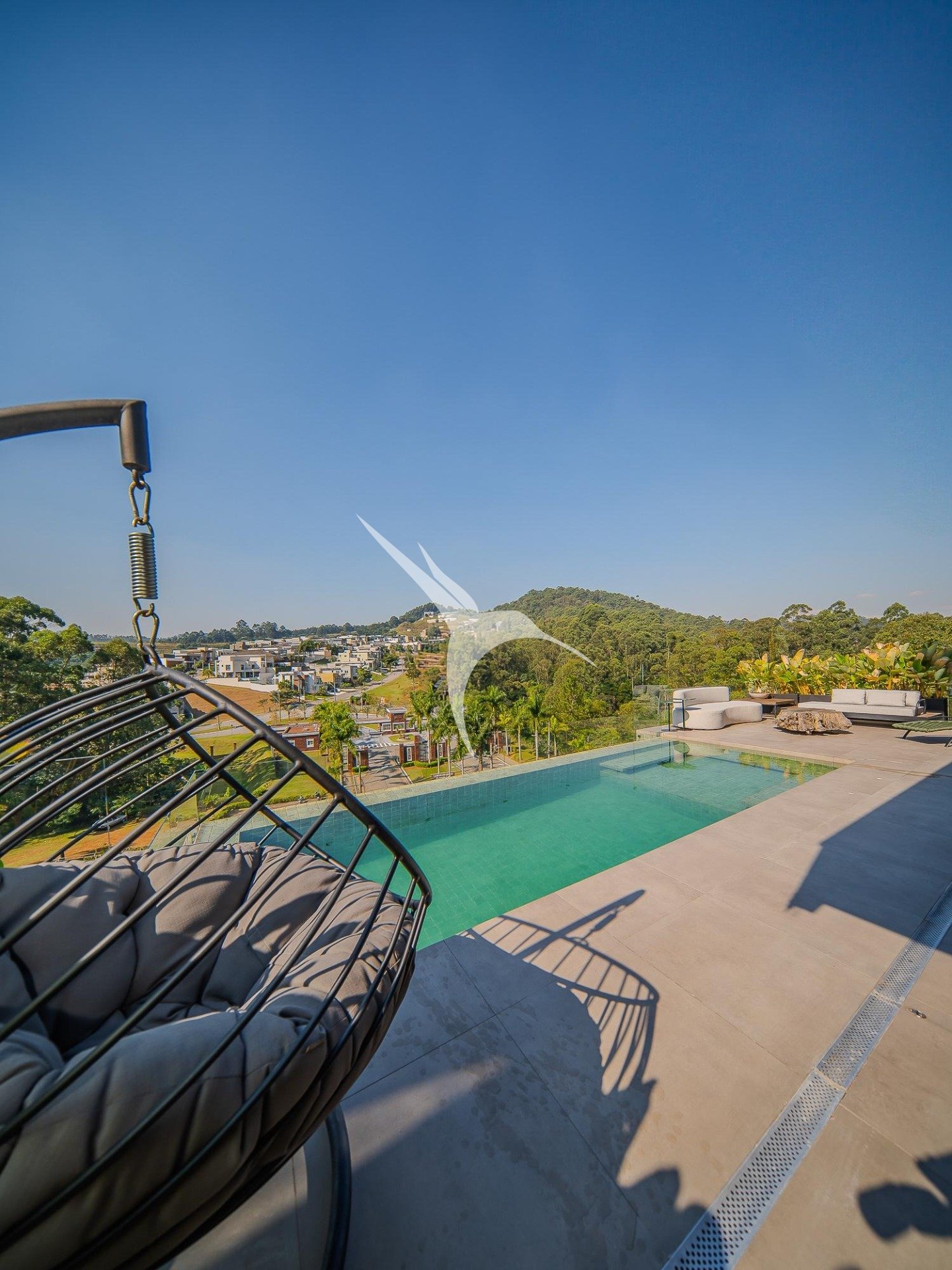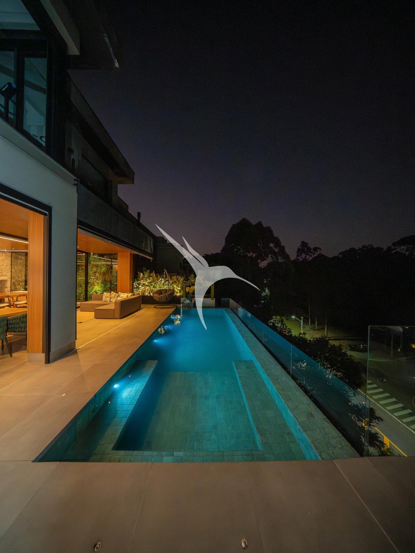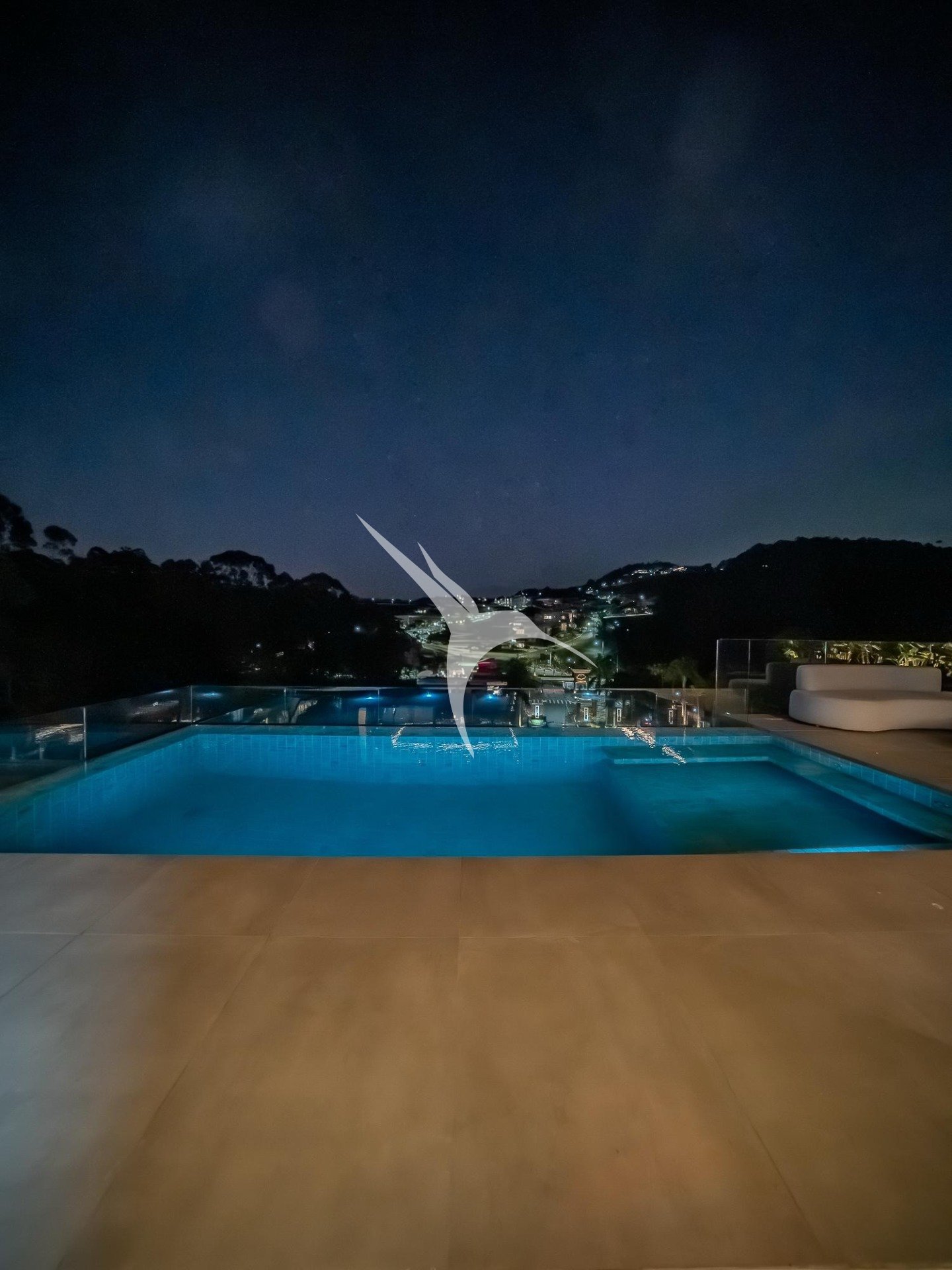 A área externa conta com uma piscina de borda infinita e spa, perfeita para relaxar e aproveitar a vista.