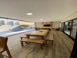 Primeiro pavimento - hall acesso social com pé direito duplo, escritório com varanda, home Theater com varanda, lavabo, sala de estar ampla com pé direito duplo, sala de jantar, cozinha completa integrada com sala + área gourmet, lavanderia com banheiro e acesso à parte externa do imóvel, área gourmet super espaçosa com churrasqueira, televisão, banheiro externo, fechamento de vidro, piscina com prainha, cromoterapia, sauna úmida com mergulho direto para a piscina, ducha externa?