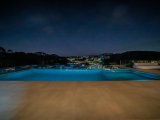 A área externa conta com uma piscina de borda infinita e spa, perfeita para relaxar e aproveitar a vista.