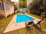 4 dormitórios sendo 2 suítes. Sala de estar. Sala de jantar. Lavabo. Cozinha repleta de armários. Copa. Despensa. Lareira. Escritório/ Ateliê. Hidromassagem. Ar condicionado. Piscina. Amplo quintal gramado. Lavanderia. Dependência de empregada.